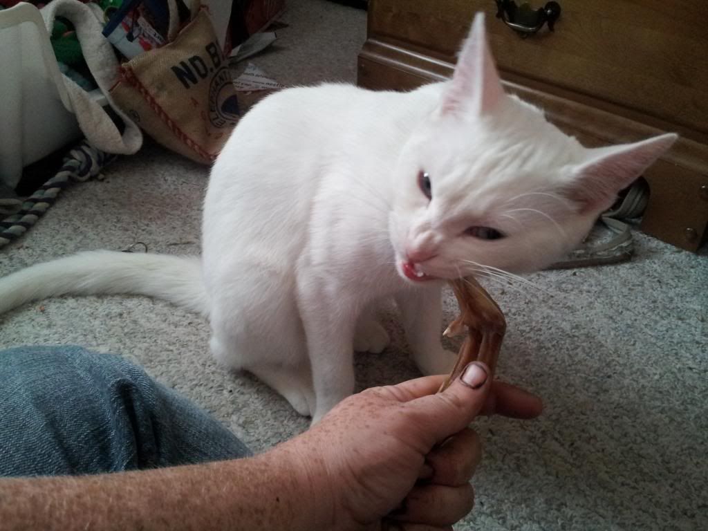 The problem is I haven't seen many hard chew toys for cats... it seems like most are soft, for kitties who like to chew catnip mice, socks, etc., and that is not Jinks. Does anyone know of any alternatives that would be similarly satisfying to chewing on wood or hard plastic? Can I give him dog bones (the real animal bone kind, not the bone-shaped treats), or would that be dangerous? I'm assuming if a bone can stand up to a pit bull's jaw without splintering, it could stand up to my 8-pound miniature panther... but I'm not totally sure. I have crunchy dental treats for him already, but I need something I could leave out for him to play with, that he won't actually consume.